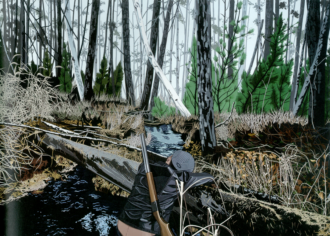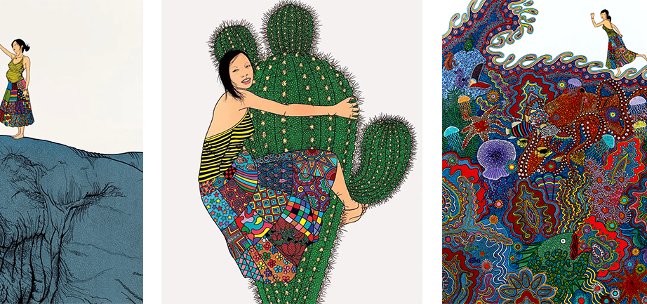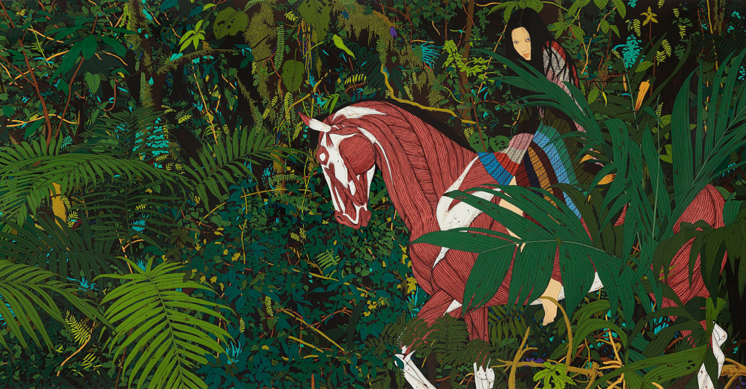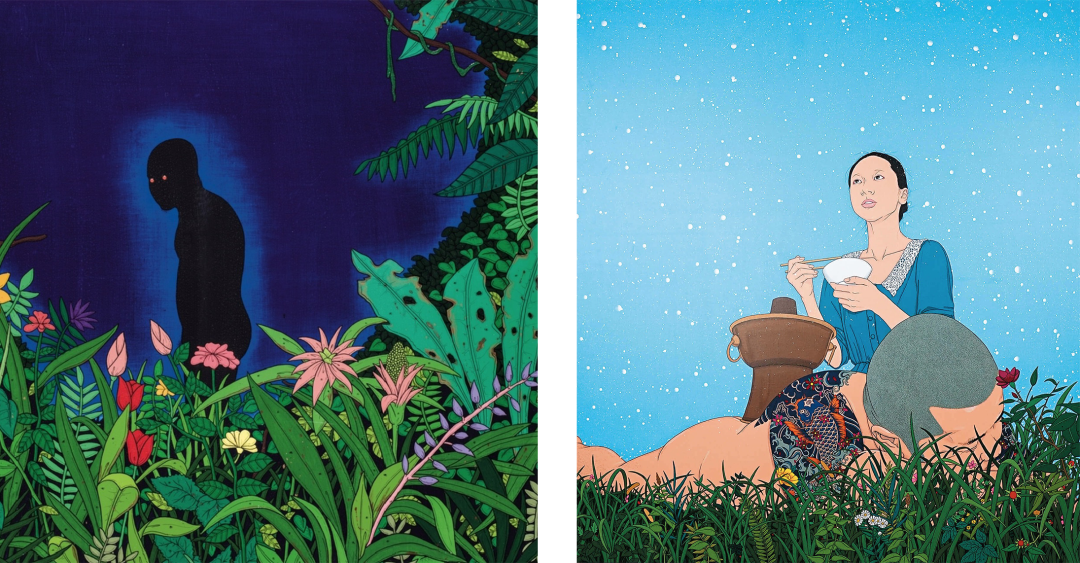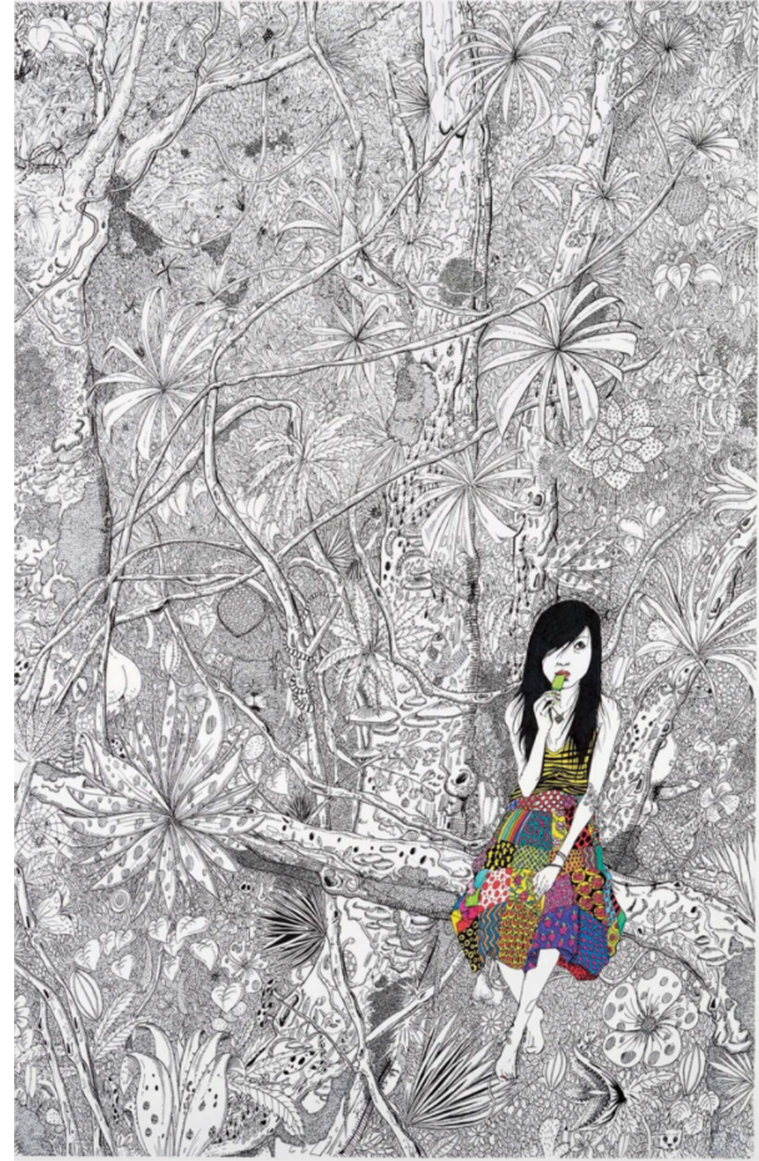 陈飞运用线条的准确性、概括性以及观念的表现力都被他把握的十分出色,其中也有脱胎于中国画中的工笔画。陈飞的作品有着细腻的造型,尤其比如对大面积的森林,花草的刻画和着色,细腻中传递着中国人对客观自然表现的哲学理念。在人物表情上的刻画,陈飞的用笔依旧可以看出传统工笔中对“传神写照”的美学追求,并且在创作中把这种语言形态带入当代绘画的创作范畴并成功的转换为了自己的风格化语言。