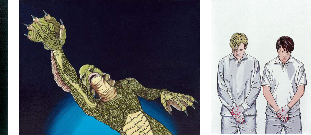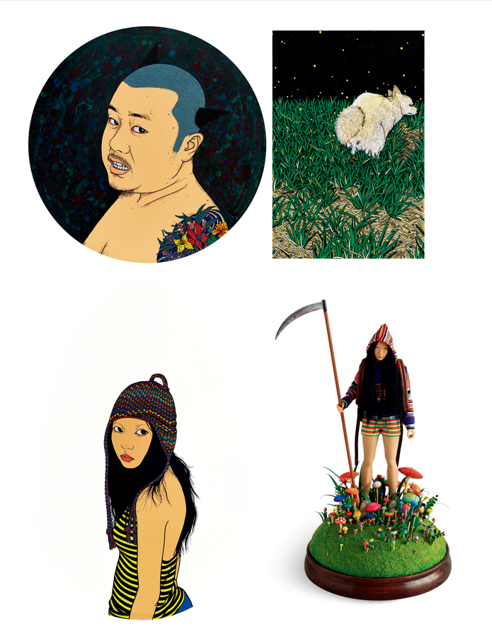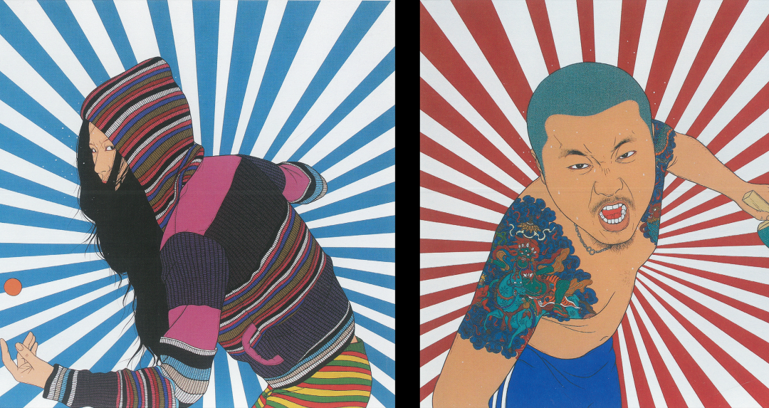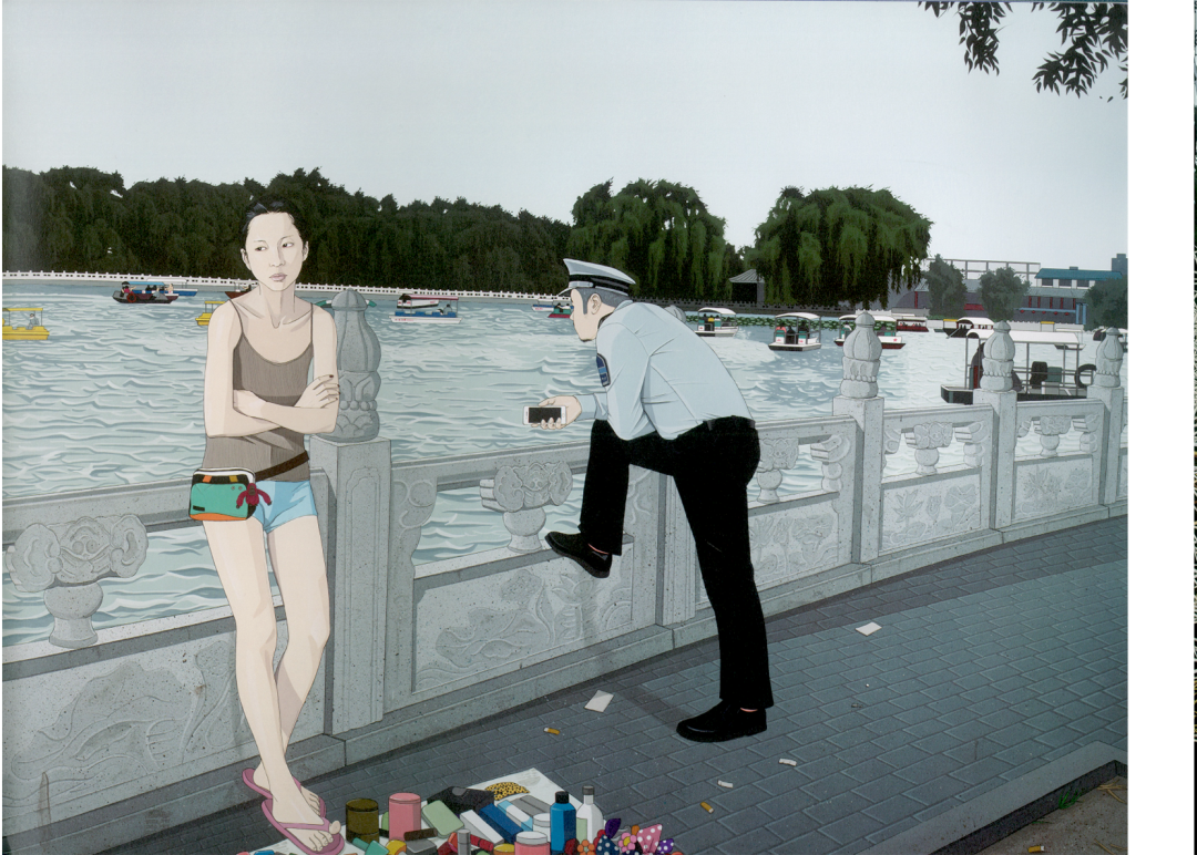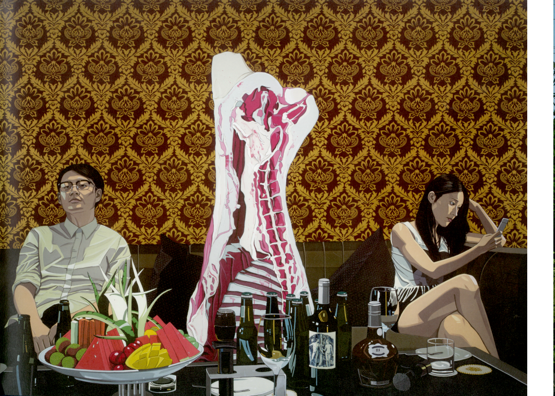 即使描绘边缘一族或另类情景,陈飞也自成一格。次文化和高雅文化的各种意象,无分中西,皆可拈来戏谑指摘。纹身或许是体表的永恒印记,但蕴含的信息却不是一成不变,背后的故事更是任人解读。陈飞不一定反对等级(次文化也会排外),只是喜欢颠覆罢了。