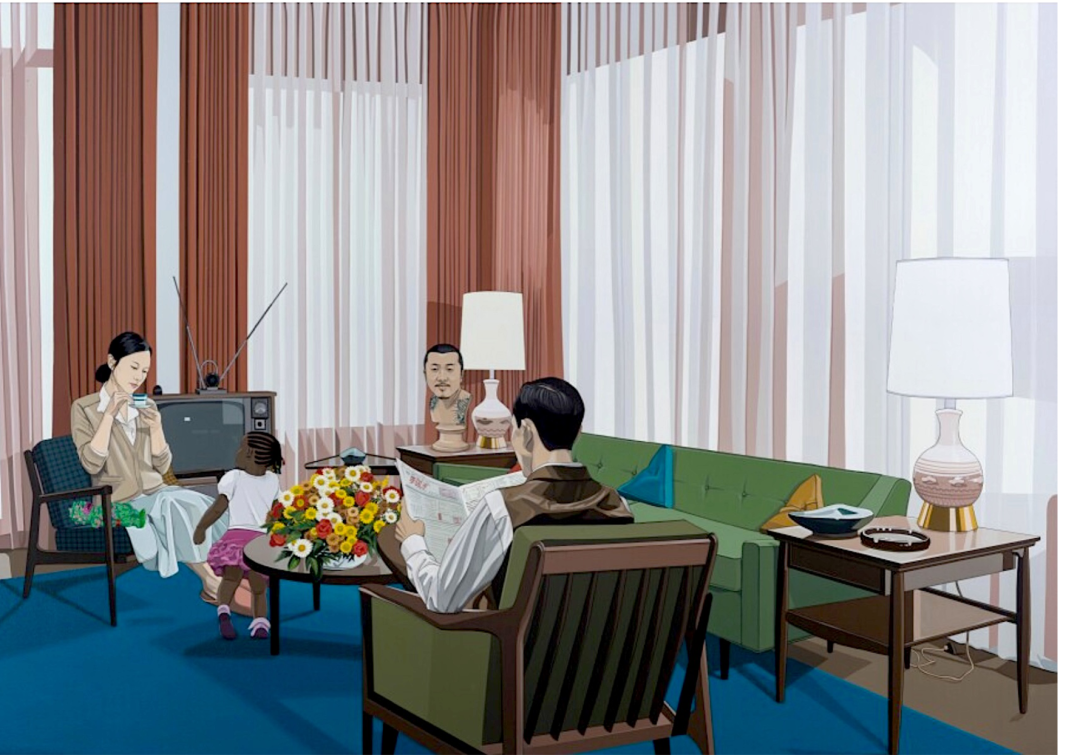 在暗讽及思考道德与政治问题的同时,陈飞也喜欢自我嘲弄。他的画作关注的并非多么宏大的题材,他擅长的是场景的编排。那些日常生活中再普通不过的场景因为繁琐的细节和角色的设定,往往能激发出紧凑的张力和出其不意的戏剧感。陈飞对细节有着近乎偏执的苛刻,墙纸上铺满的盛放的鲜花、繁茂而芜杂的丛林、浓密的毛发……陈飞不吝笔墨、不厌其烦甚至是机械地勾勒每一根线条、每一个细微之处,也正因如此,才为作品注入了强烈的写实感和剧照感。观者立于画布前,往往会因为不安而退后,却又不由自主地被“绑架”着去揣度画布里的叙事和角色的心理。