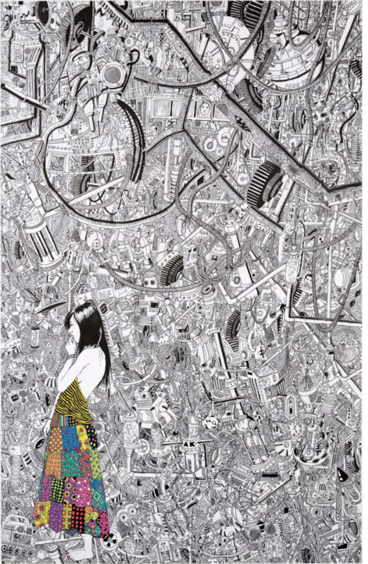 “凑近点看陈飞的绘画,你就知道什么叫做用视觉的方式定义‘顽强’了。如果将来艺术史里能有个‘工笔丙烯画’的流派,那铁定要推陈飞为鼻祖。用他自己的话说,他就是那种‘实力派’艺术家,近两年的作品几乎没有哪张能在三五个月内完成,不是他的效率低—那可真不是人干的活儿啊—丝毫不能乱的人毛狗毛、像迷宫一样复杂的机械构造、几乎令人窒息的花海、还有动不动就上百人的肖像...”—— 房方