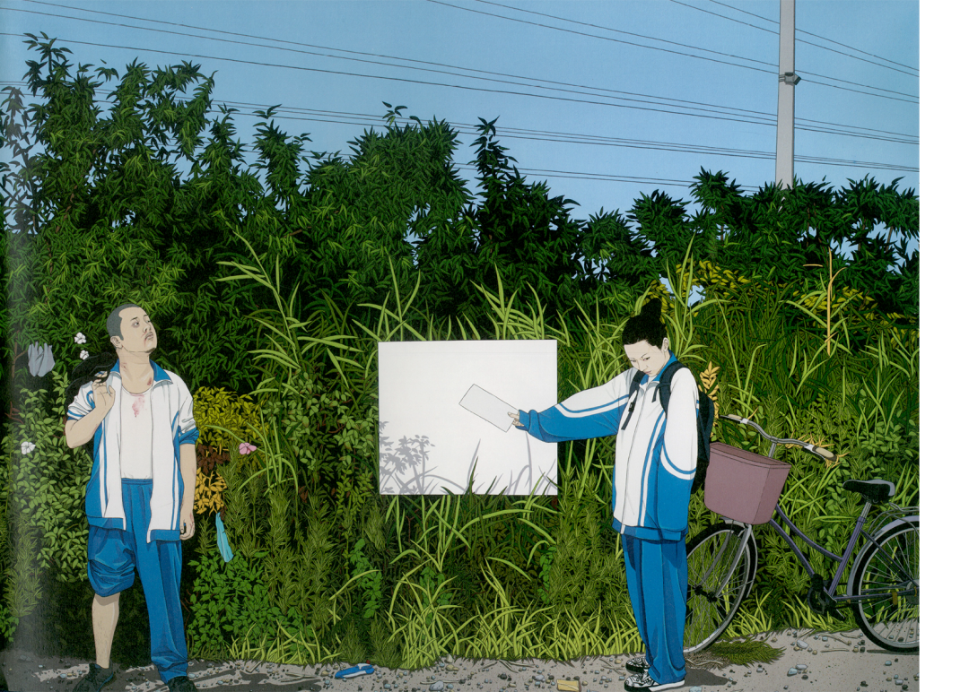乍看之下,该系列似与陈飞之前的为人熟知的肖像绘画存在取向上的分野:主体刻画与情景建构脱离了早期士郎正宗的趣味;易被拓展的叙事空间变得扁平与质朴;波德莱尔式的激情也从画面中退潮。