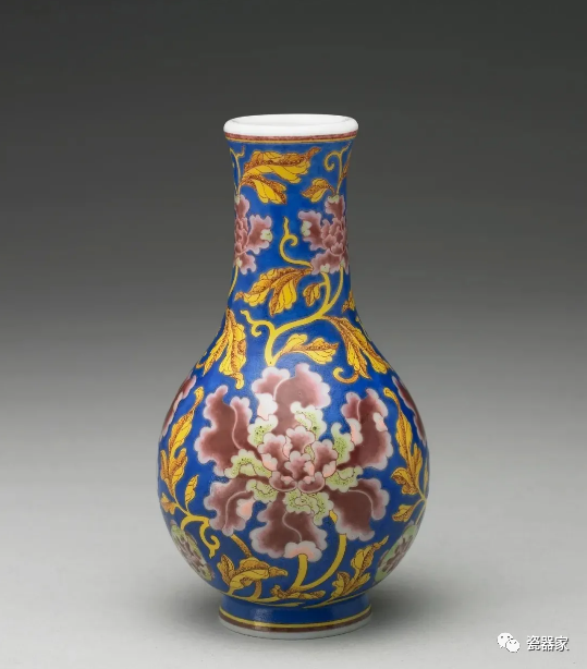 清康熙 玻璃胎画珐琅牡丹蓝地胆瓶
