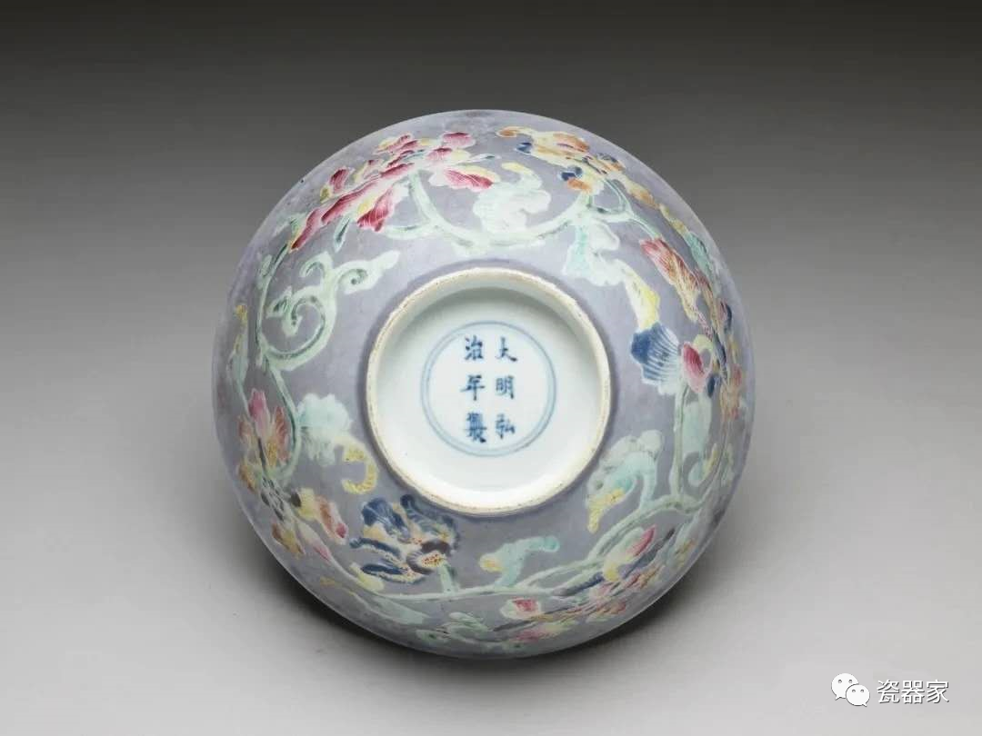 清康熙 浅紫地花卉碗 “大明弘治年制“”款