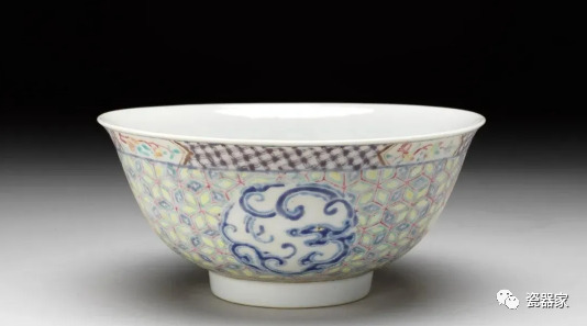 这件碗共画有五枚团螭纹,对比景德镇烧制的瓷器和广东生产的铜胎制品,大约可以铺陈出团螭纹自康熙朝出现后,逐渐蔚为流行至纵跨整个18世纪的状况。另外,碗外开光纹样之外,由相当尺寸的方格逐一堆栈完成锦地图案,在单面个别标记蓝彩“十”字下,不仅突出每一个立方体的造型,也同样让平面图案更加丰富有变化。