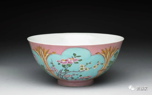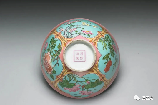 清康熙 珐琅彩粉红地开光四季花卉碗