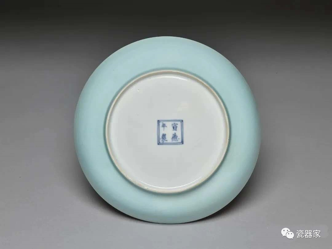 清康熙 天蓝釉胭脂红彩暗龙盘 “宣德年制”款