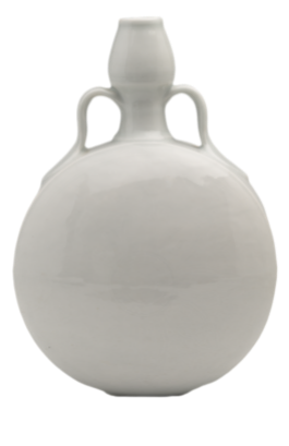 此器通体施白釉,造型有永乐遗风,表面雕刻阿拉伯式轮花等图案。样式仿自西亚地区的陶制、铜制水壶,俗称“抱月瓶”或“宝月瓶”。