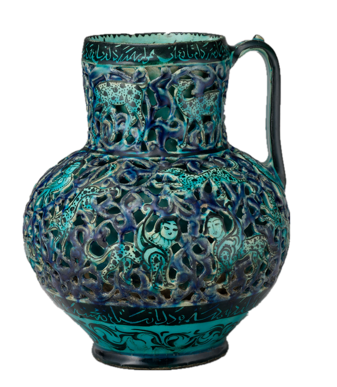 此类单柄陶罐为永乐、宣德瓷质花浇的原型。其质地见有金属、釉陶、玉石等。图示这件单柄陶罐分内外两层,内层可盛水,外层镂空且饰有波斯文诗句和鸟身女妖、斯芬克斯等异兽。