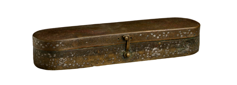穆斯林制作的金属笔盒多为长条形,单侧开合,内部存放多种尺寸的芦苇杆笔,并设有墨池。永乐、宣德时期的瓷质笔盒与此形制类似,但器表纹饰罕见星座之类域外流行题材。