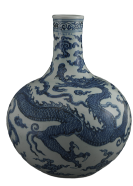 天球瓶是永乐年间景德镇御窑创烧的新器型。这类青花龙纹天球瓶,见于永乐、宣德两朝。该瓶腹部所绘巨龙,腾跃于云间,龙首回望,凶猛矫健,极具张力。瓶口部横书“大明宣德年制”款。