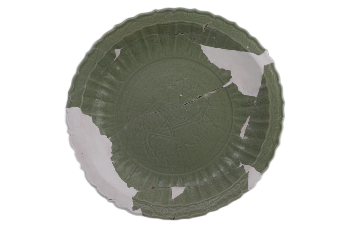 通体施青釉,内底刻划松竹梅纹。釉质厚重坚致,色泽细腻温润,淡雅匀净,质感甚佳。整器线条浑厚有力,为明代龙泉窑精品。中东地区博物馆多见这类龙泉窑大盘。