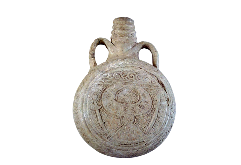 西亚地区的此类扁壶,在西方学界俗称“朝圣者水壶”(pilgrim flask),这一设计便于长途旅行携带。叙利亚、埃及等地有悠久的陶质、玻璃质扁壶生产传统。