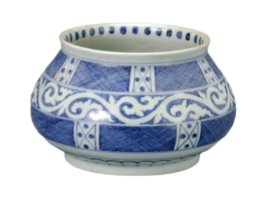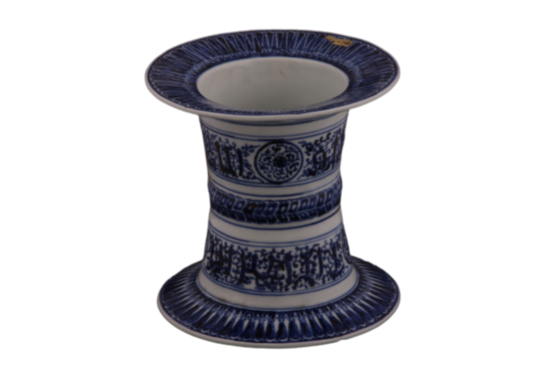 该器是宫廷为郑和下西洋定制的瓷器类型之一,是仿照伊斯兰黄铜器座而来的。器身呈筒状,中空无底,上下出宽沿。器身以青花绘阿拉伯文字及植物纹。