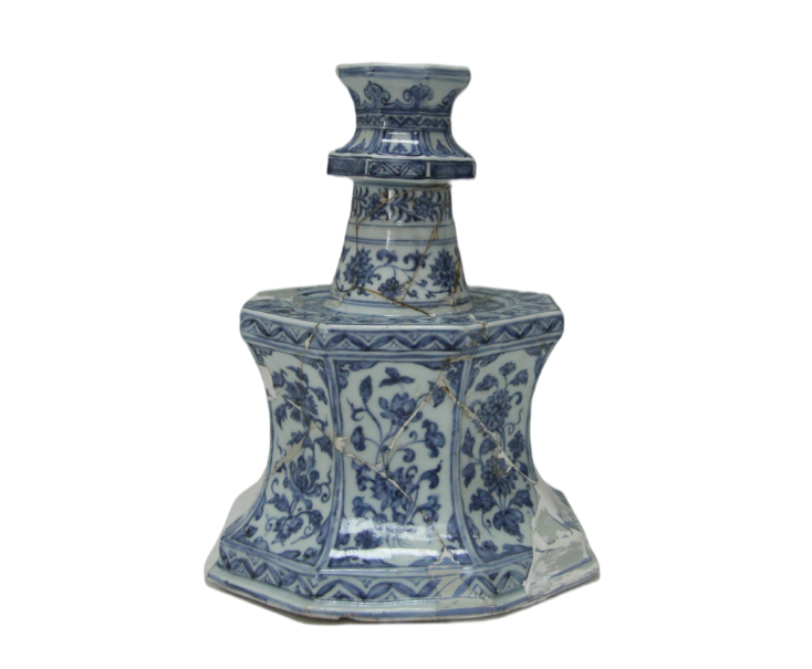 该器用以承插软心蜡烛,烛台与底座均呈八棱台式。自口部至器底共11层青花纹饰,包括如意云头纹、变形莲瓣、网格、海水、半钱、花卉等。此类八方烛台多为永乐、宣德制品,模仿13至14世纪阿拉伯地区铜烛台器型。