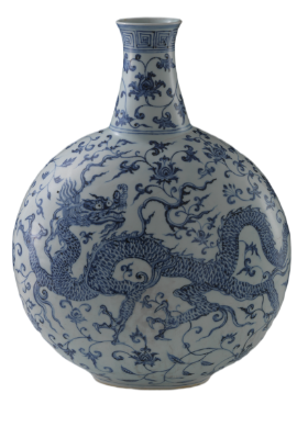 壶身呈扁圆球形,体型较大。颈部上端饰回纹,下部饰缠枝花卉纹,腹部两面均饰龙穿花图案。