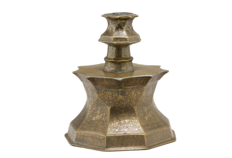 阿拉伯世界的铜烛台多呈圆台形或八方形,为永乐、宣德御窑八方烛台的原型。图中所示为九方烛台,形制罕见。