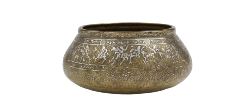 图示器物为永乐、宣德青花鱼篓尊的原型。波斯伊尔汗国时期(1256~1335年)流行一种嵌金银的铜器制作工艺。此类铜器的装饰纹样细密繁复,题材不仅包括伊斯兰特色的几何纹、花草纹、谚语或诗句,也表现人物题材如乐手、骑马人物等等。