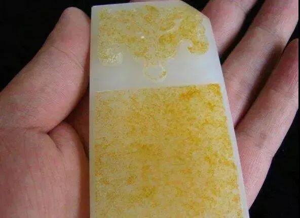 其颜色金黄、呈撒状分布,多以点状、片状的形式出现,好像在玉质之上泼洒了一层金子,洒金皮,泼散如洒金。惹人喜爱。