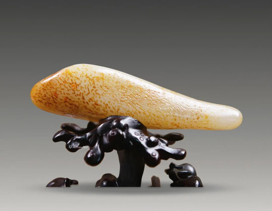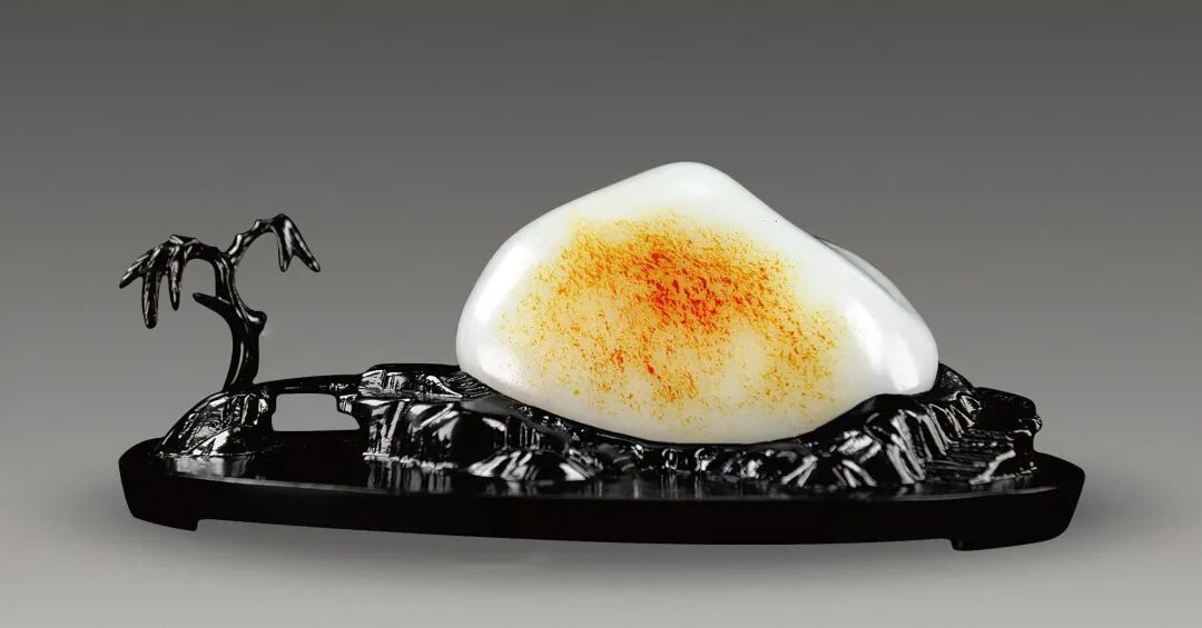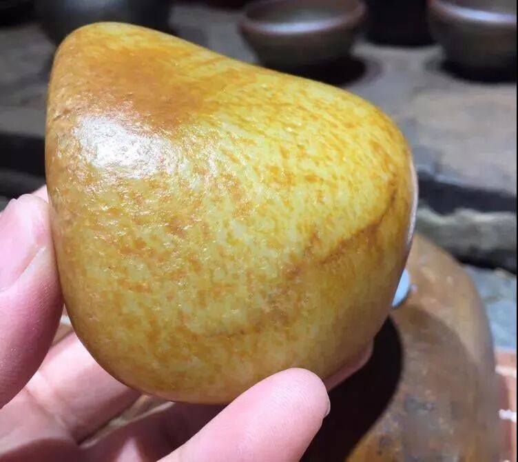 谈皮色不得不提洒金皮,是玉友最爱皮色之一,这是2019年秋季艺术品拍卖会上,以22万成交的一个洒金皮“小金蛋”,重60克,其颜色金黄、呈撒状分布,十分的富贵漂亮。