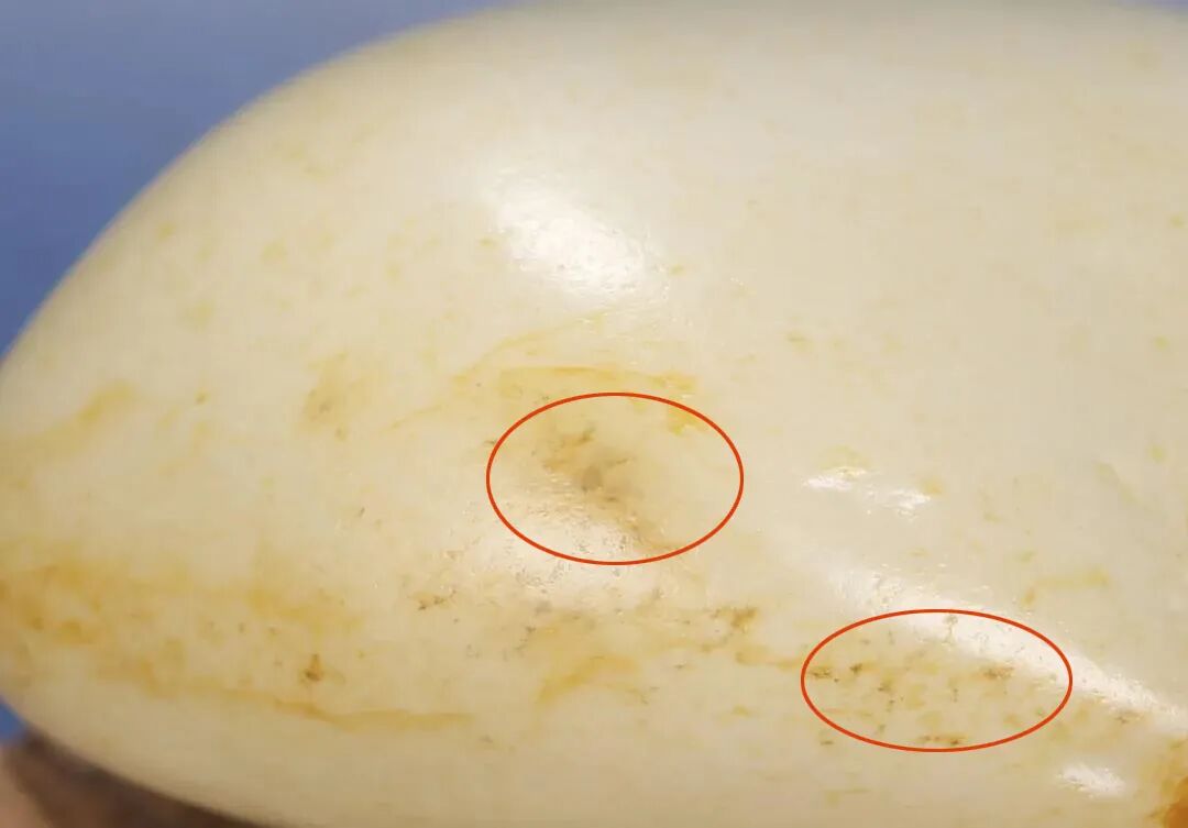 此外,我们可以通过一些籽料的特征鉴别,洒金皮虽然薄,但是也会出现一些“脏”,类似于水草沁现,就像这样: