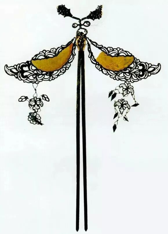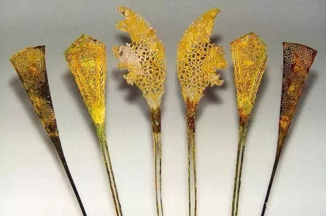 发钗与单股的发簪不同,是为双股,故而常常被视为爱情的象征。钗的造型多样,名称也十分形象,如花钗、燕钗等。唐代头部装饰复杂华丽,出现运用模压、雕镂、剪凿等方法制成的各种金银花钗。