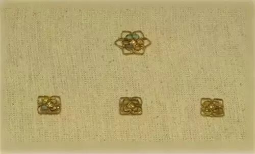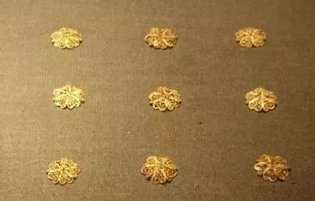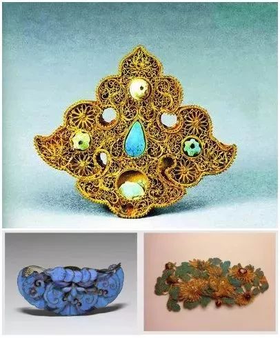 △镶嵌绿松石的“金筐宝钿”花饰运用了掐丝、炸珠、焊接、透雕、锩镂、镶嵌、抛光等多种复杂工序,反应了盛唐时期高超的工艺水平
