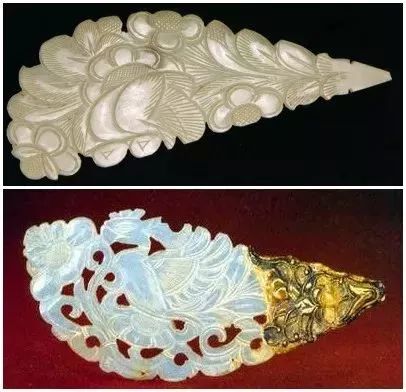 △唐代簪头两件,上:鸳鸯海棠纹玉簪头,下:玉镂雕丹凤纹鎏金簪头