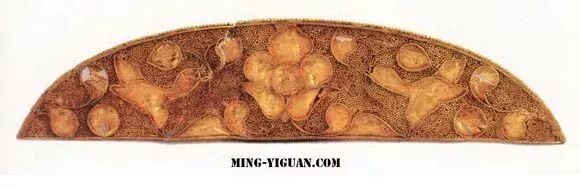 △唐代鸿雁衔枝纹金质梳背,长7.5cm,高1.8cm,厚0.16cm,用炸珠工艺填金珠为地,留白处框以鸿雁衔枝纹样