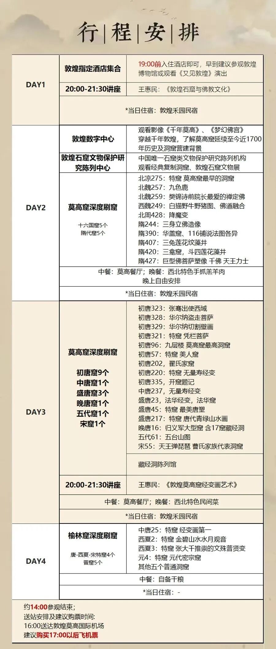 它是丝绸之路上最美的明珠,是我们一生一定要去一次的地方,是走遍世界之后依然魂牵梦绕的朝圣殿堂。公元前139年,张骞出使西域,丝绸之路开通。大漠边关敦煌,这个通往西域的重要门户,逐渐成为沟通中西的文化商贸重镇。莫高窟第323窟张骞出使西域图初唐图源/敦煌研究院驼铃声声,往来使者络绎不绝,四方文明在这里交汇融合,写下绝美的篇章,留给世人丰富的文化遗产。这其中最为著名的当属世界艺术宝库——莫高窟。735座洞窟,2000余尊彩塑,45000多平方米壁画……庄严的佛像,斑斓的色彩,千年的历史变迁和艺术积淀,莫高窟丰厚的宝藏,总也说不完。莫高窟第45窟西壁龛内北侧 左胁侍菩萨 盛唐吴健/摄而莫高窟的“姊妹窟”——榆林窟,亦是惊艳的壁画艺术宝库。如此精彩绝伦的敦煌石窟艺术,要怎样才能读懂?和我们一起去敦煌吧!元旦与春节任选一期,集中三天时间来看敦煌石窟中的精华!此行,我们将打卡莫高窟、榆林窟所有开放特窟,深度探索敦煌石窟艺术。从十六国开始的千年营造经历着连续的发展演变,从西域风格逐渐吸收中原文化,从形象到题材,按照时代顺序观赏洞窟,让你能够思维清晰地发现敦煌石窟的变化的规律!已刊著述110余篇(部),代表专著:《敦煌佛教与石窟营建》《敦煌佛教图像研究》《敦煌历史与佛教文化》等。代表论文:《关于<天请问经>和天请问经变的几个问题》《敦煌321窟、74窟十轮经变考释》《吐蕃长度单位“箭”考》《敦煌莫高窟第320窟大方等陀罗尼经变考释》等。敦煌研究院资深讲师敦煌研究院的“门面担当”,堪称“半个敦煌学专家”,拥有多个领域的知识储备,带给您高品质高标准的讲解服务。敦煌研究院专家王惠民老师2场深度讲座+研究院资深老师深度实地讲解。按年代顺序从十六国-隋-唐-五代-宋-西夏-元,选择代表性洞窟按顺序刷窟,通览敦煌艺术千年历史变迁,对比学习更立体。3天时间2座最经典石窟群,35+座精选洞窟,一次看遍全部开放特窟;纯学习无购物,特别定制版游学团。赠送配套莫高窟、榆林窟线上课程4讲约8小时超长课程,提前做好预习。石窟专题游学内容较专业,我们将配套赠送线上课,建议提前学习以更好地辅助游学。洞窟参观顺序或根据现场实际情况进行微调,介意者甚拍!简要看点:“北凉三窟”之一,莫高窟现存最早洞窟之一,且为北凉三窟中面积最大、内容最为丰富洞窟。此窟西壁中央的主尊像神情庄重、威严肃穆、比例均称,造型风格及坐具、服饰均表现出西域佛教艺术的影响,具有典型的十六国时期造像特点。此窟以早期土红色为底色绘制了“本生故事画”和“佛传故事画”。简要看点:佛龛内的凭栏眺望的天宫菩萨是该窟壁画最大亮点,大量色彩明快的蓝色表现的天宫和脱壁而出、满壁风动的飞天图像。主室南壁描绘极其少有的《十轮经变》图,花雨风飞、落樱缤纷,尤为突出的是佛经内容中地藏菩萨救助苦难和各种变化以及东半部分大型院落的生活百态。整幅壁画以错落有致又自然和谐的青绿山水为背景分割内容,实属精品。简要看点:此窟最大的看点是南壁说法图东侧的胁侍菩萨像。这身菩萨头戴化佛冠,上身半裸,肩披长巾,身佩璎珞,体态优美,肌肤细腻,身体略呈S型,目光下视,若有所思,显得富贵而华丽。菩萨两眼微微下视,身体稍稍内倾,又显出了东方女性的娇柔和妩媚。因此,有人把她称为“美人菩萨”,也因为这身优美的菩萨像,57窟得名“美人窟”。简要看点:此窟保存有“贞观十六年”(公元642年)的墨书题记,为洞窟断代提供了确凿依据。南北壁通壁分别绘西方净土变和东方药师经变,场面恢宏、色彩瑰丽、人物众多、构图精细,为唐代佳作。东壁绘维摩诘经变,其中的维摩诘像乃人物画之精品。下部绘听法的帝王群臣,与传世初唐画家阎立本的名作《历代帝王图卷》相比毫不逊色。简要看点:此窟中的塑像是莫高窟唐代塑像的杰作,是莫高窟最具写实性的群塑。南壁绘制的观音经变取材于法华经观音普门品,画面情节丰富、描绘生动、构图巧妙、扣人心弦,皆为现实社会之真实反映,是研究唐代社会生活的形象资料。北壁的观无量寿经变延续了莫高窟盛唐典型的三联式构图,画面完整,色彩艳丽,实属不易。简要看点:保存有大幅以山水画为背景的经变画,整个画面富有中国独特的田园诗歌般的青绿山水画气势恢宏的琼楼玉宇,尽显盛唐描绘的佛国极乐世界。壁画中各种乐器不鼓自鸣,飞天扬手散花,飘逸飞动;水池中绿波荡漾,水鸟游乐其中,莲花童子形象可爱。此窟经变画结构繁杂、色彩富丽、绘制精美,充分体现盛唐艺术的伟大成就。简要看点:25窟是敦煌地区最为突出的洞窟,也是壁画中的极品。与其他洞窟氧化变色不同,这里主室四壁壁画均保存唐代原貌,画风细腻,色彩绚丽,艺术造诣尤高。主要内容有:前室门上残存有毗沙门天王赴哪吒会,门南和门北分别绘南方天王和北方天王;主室窟顶残留有千佛;正壁绘密宗八大菩萨曼荼罗经变;北壁绘弥勒经变;南壁绘观无量寿经变;前壁门两侧分别绘文殊变、普贤变。丰富的佛教人物绘画中融入诸多唐代生活场景,如舞乐图、吐蕃婚礼图、耕种图等。简要看点:西壁两侧各保留了一幅水月观音画像,为西夏壁画上乘之作,也是敦煌石窟水月观音画像中最精美的,最被人所称道的。画面皆以清新淡雅的石青石绿等冷色调表现,将“