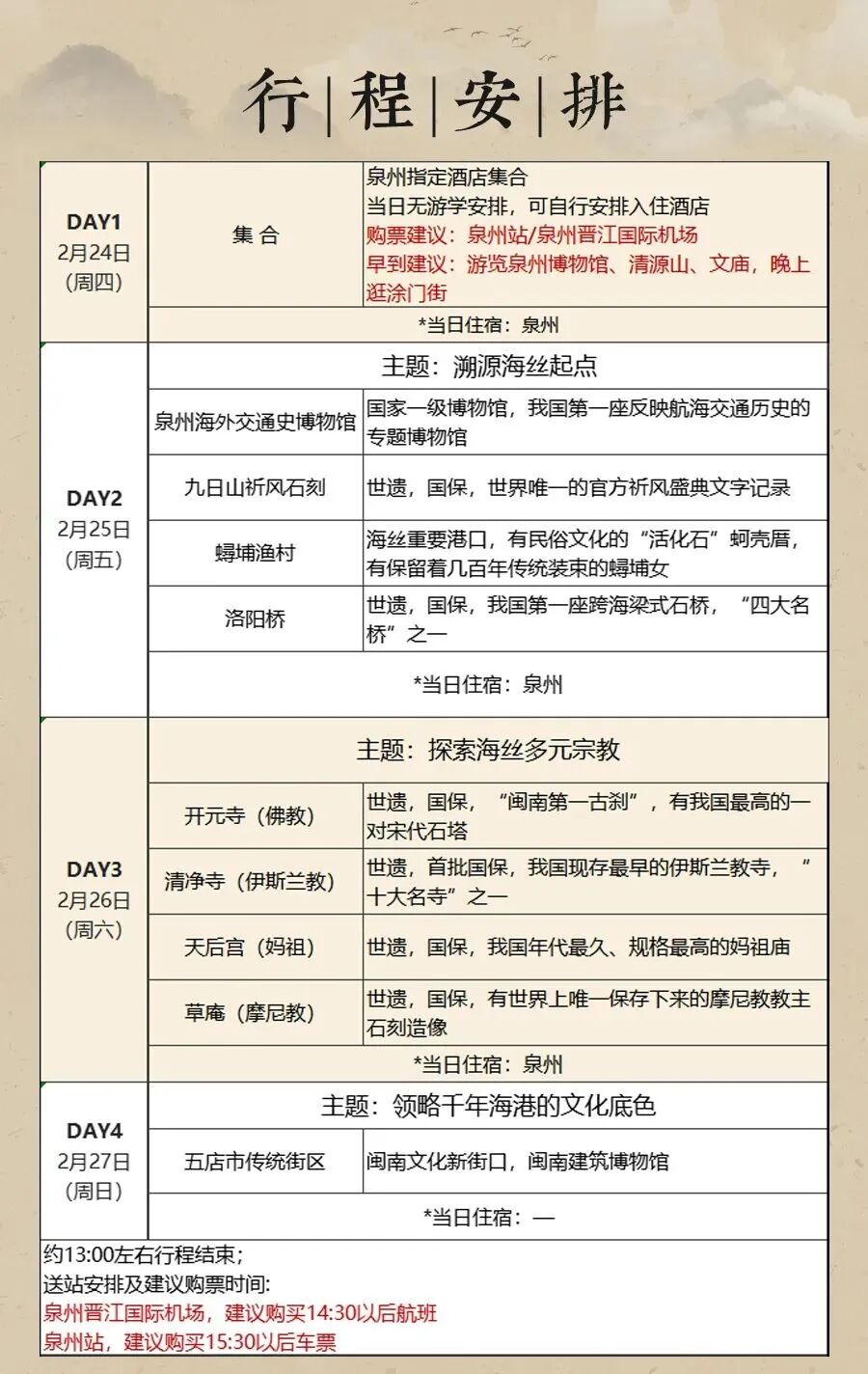 由泉州文化传播大使魏怀阳老师和泉州文化专业研究学者刘伯孳老师全程带队游学,从历史、地理、人文、民俗、宗教、建筑等多角度专业解读,系统讲解,全程零距离沟通解惑。路线由专注于文化游学4年的资深团队精心设计,每一处选点都经过多次踩线与实践。围绕海丝遗存,溯源泉州海丝发展历史。我们将走访1座专题博物馆、6处世界文化遗产要素、1处海丝重要港口和1处闽南文化传统街区,全面系统地了解海丝为泉州文化带来的多元变化,体会海丝影响下的闽南文化独特魅力,感受泉州这座城市的开放与包容。一路闽南特色美食相伴,寻味“古早”,在不同的美食中,品味泉州文化的兼容并包。特别提示:行程内需要大量站立或行走学习,请穿着舒适的运动鞋或休闲鞋。泉州海外交通史博物馆-九日山祈风石刻-蟳埔渔村-洛阳桥