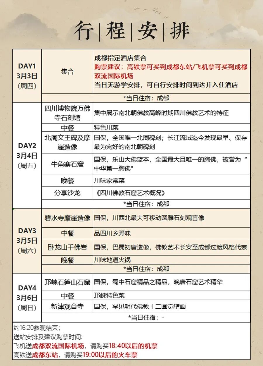 适合人群:历史人文爱好者/访古者/石窟爱好者/佛教美术从业者/考古与历史专业人员*8人成行,20人封团(如有单房差或向上浮动1人)*报名需二次确认。请不要购买高铁/机票大交通,待客服通知成行后再安排购买。1.交通:行程内全程空调旅游巴士