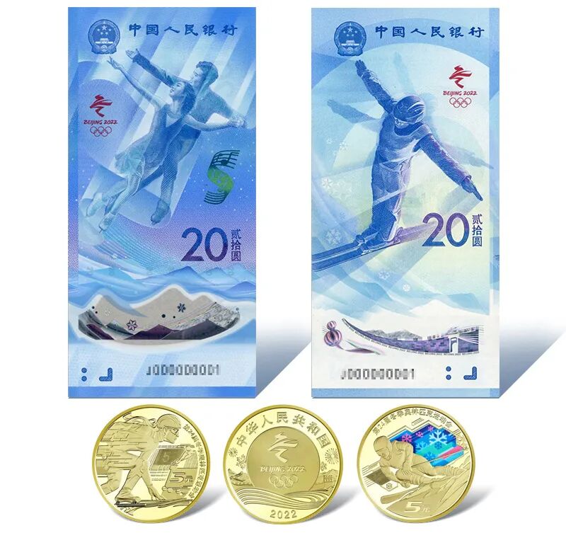 冬奥币面值5元,一套2枚,每人可预约兑换20套;冬奥钞面值20元,一套2张,每人可预约兑换20套。