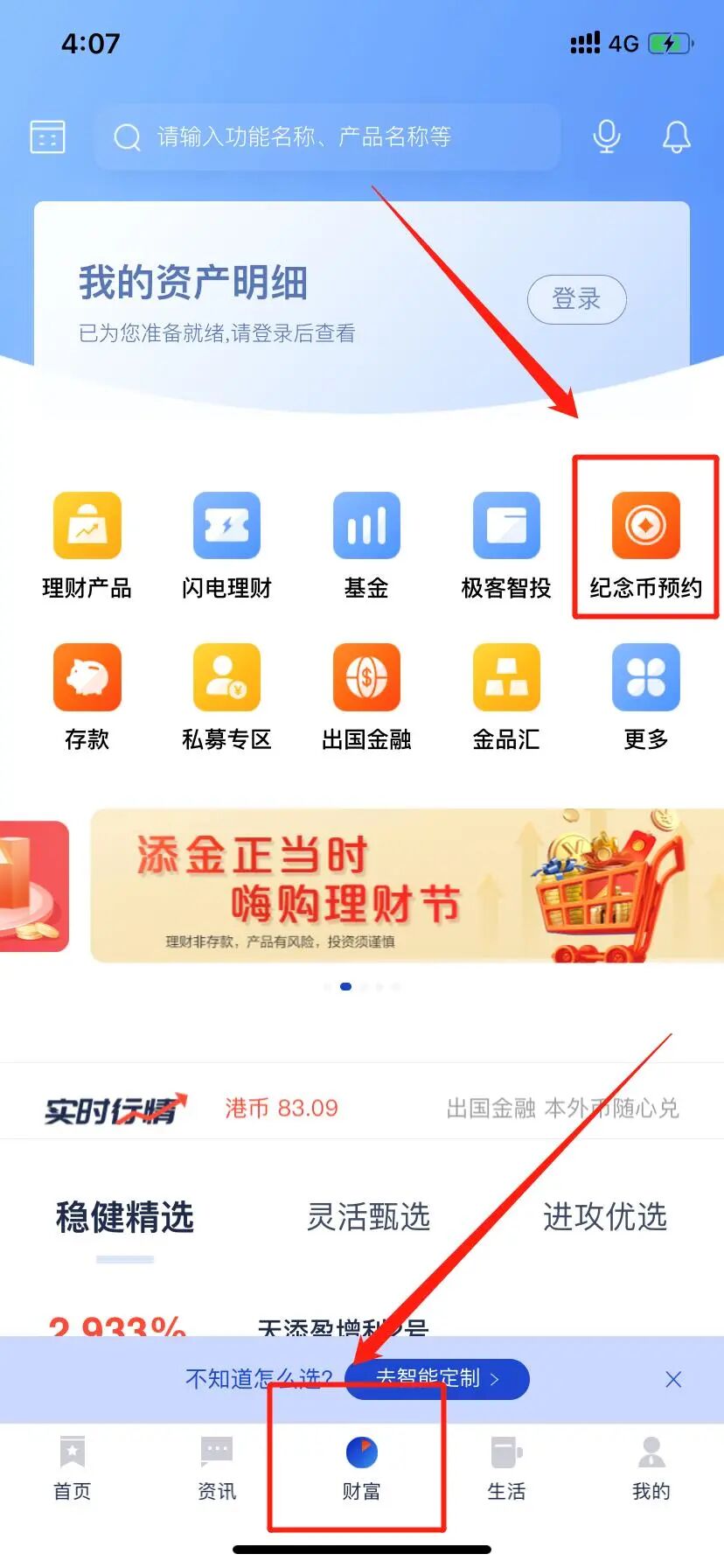 下载“浦发银行”手机银行APP,首页点击财富-纪念币预约,即可进入预约界面: