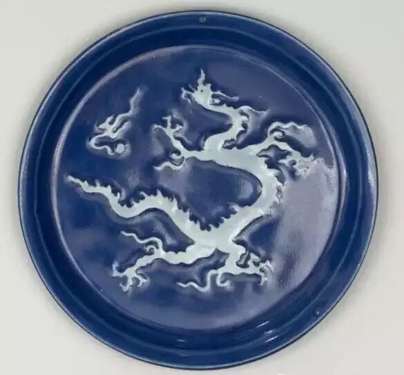 蓝釉白龙戏珠纹盘 元,约 1320 ~ 1350 年 大维德藏