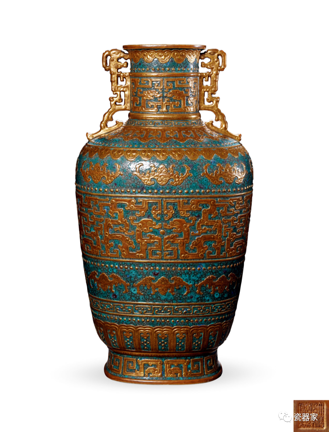 清乾隆 仿古铜釉彩描金浮雕「夔龙拱福」双螭耳瓶