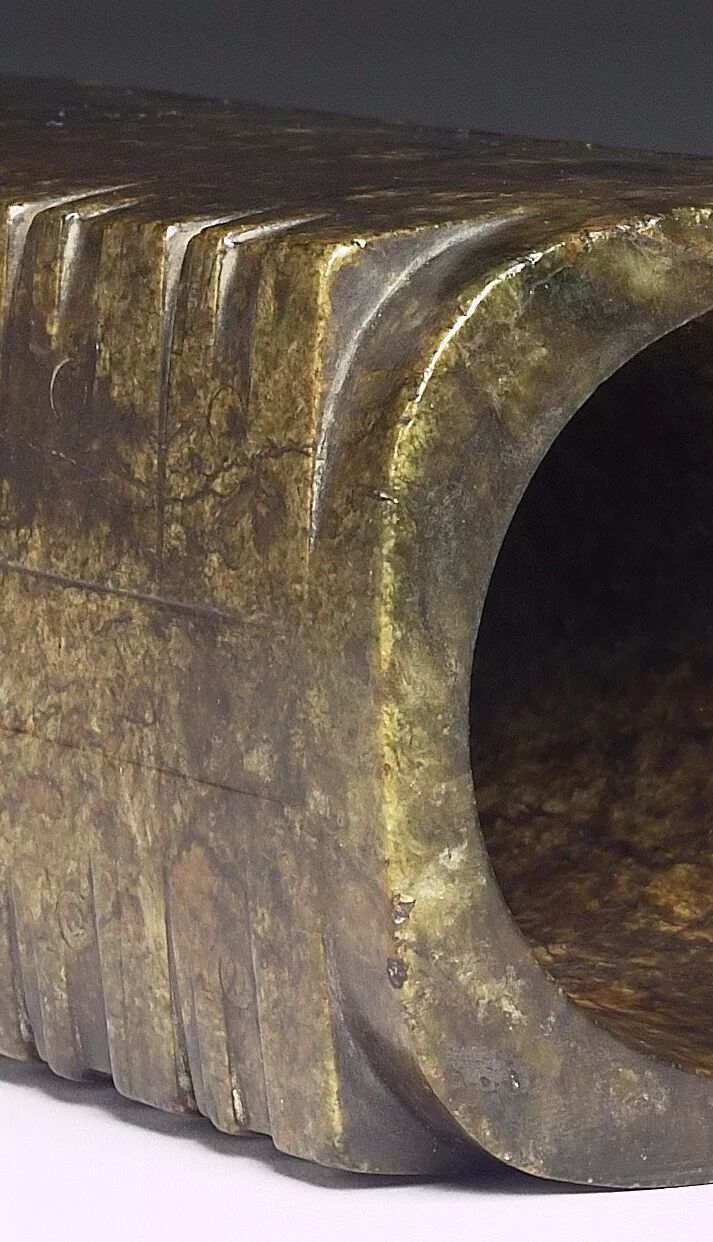 它是以深碧绿色泛深浅赭斑的闪玉(Nephrite)琢成。表面还留有最初切璞时的圆弧形凹陷痕。高方柱体,略呈上大下小。中孔由两端对钻,接合处有不整齐的台阶面。上射口略外撇,下射口较直。