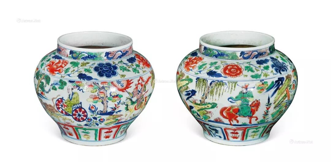 三、纹饰:康熙五彩不仅造型优美,而且花纹装饰更是题材广泛,包罗万象。造型与纹饰有机地结合在一起,图案布局巧妙合理,常见有各种植物花卉,花鸟鱼虫,山水人物纹等。其中山水画和人物故事大量出现,如耕织图、渔家乐、农家乐、寒江独钓、携琴访友、竹林七贤、婴戏图、八仙过海、五老图、麻姑献寿、洪福齐天、万寿无疆等。同时还有民间流传很广的历史故事及取材戏曲小说的《三国演义》、《隋唐演义》、《西厢记》、《封神演义》、《水浒》等。其中以三国、水浒故事情节做装饰的最多,这些描绘武士的所谓“刀马人”图案最为名贵,人物活灵活现,生动有趣。画风上受明末画家陈老莲影响,所绘仕女,发髻高耸,脸庞丰满,眉似弯月,唇似朱点,人物形象都比较大,往往占据器物整个空间。官窑五彩以绘龙、凤和缠枝莲花最为典型,图案画工均极精细规矩。