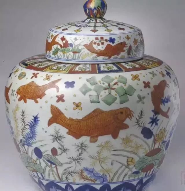 故宫博物院藏明嘉靖五彩青花鱼藻纹盖罐
