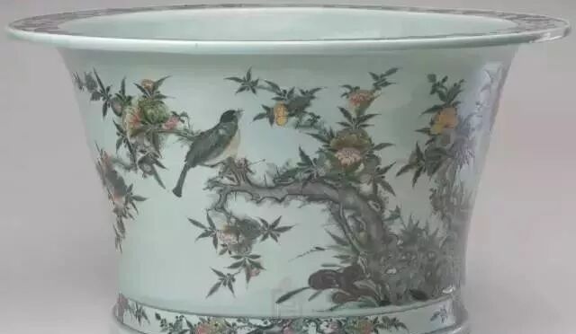 故宫博物院藏清康熙豆青釉五彩花鸟纹花盆