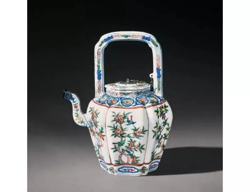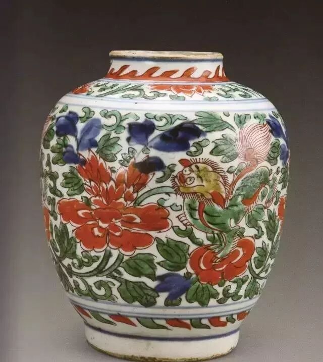 二、造型:康熙五彩器型千姿百态,仿古创新,式样繁多,并且制作精巧。既有陈设瓷,也有日常生活用瓷。比较常见的品种有盘、碗、碟、十二月花卉杯、各式花盆、盖盒、将军罐、鱼缸、壁瓶、筒瓶、玉壶春瓶、梅瓶、观音瓶、油槌瓶、棒槌瓶、葫芦瓶、马蹄尊、橄榄尊、琵琶尊、花觚,各式茶壶、多穆壶、笔筒、瓷塑、香薰、香炉等。总体风格是大件器物制作规范,尽管体积较大,但极少变形,形体线条既多转折变化又挺拔向上,风格朴实,浑厚有力,粗犷豪放,尤以新出现的凤尾尊、观音尊、棒糙瓶最具典型。