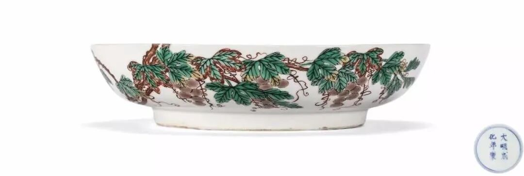 松鼠葡萄纹为明、清两代瓷器装饰题材中,较为名贵的一种。明代文献中,曾记录葡萄纹样斗彩杯、盘的名贵程度高于鸡缸杯,目前存世器物也少于鸡缸杯。葡萄纹被称为「一串金」,但直至明代末期,其审美略有改观。从嘉靖到明末文献上,虽还延续以「五彩葡萄杯」、「一串金」称之,但并没有描述器型,此类画葡萄的成化彩瓷即为当时极为推崇的「五彩葡萄把杯」;但到明末清初却已销声匿迹,不为人所提。而「鸡缸杯」却被主流审美推崇至首,而后,提及成化彩瓷器,仅只提鸡缸杯的评价形式,亦变成了有关陶瓷论着的固定形式。