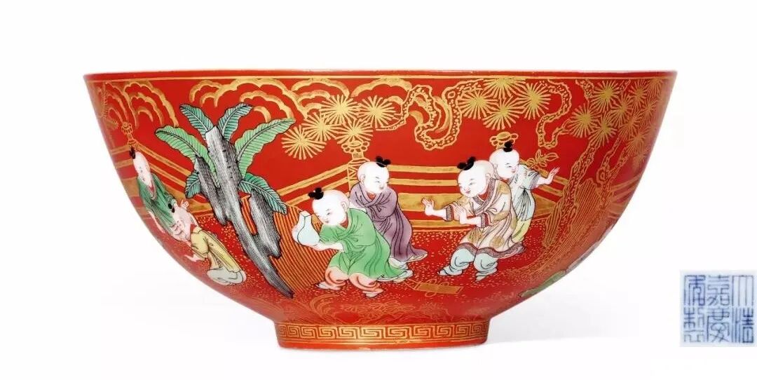 本品此碗口微撇,深弧壁,圈足,外壁满施珊瑚红釉,外壁以珊瑚红釉为地,通景以五彩绘庭院婴戏图,松林庭院间,十六童子济济一堂,面庞圆润喜悦,神情稚拙可爱,或围缸戏水,或执木偶,或碰瓶而视,呈现出热闹欢快的喜庆气氛。其后景色以金彩描绘,清幽雅致,绚丽夺目。全器画艺细腻流畅,纹饰繁缛华丽,主题吉利祥瑞,寓意连生贵子、五子登科、百子千孙,亦有祈福求安之意,代表了清嘉庆时官窑瓷艺的最高水平,品相完美,可为珍贵。底部青花书「大清嘉庆年制」三行六字篆书款。