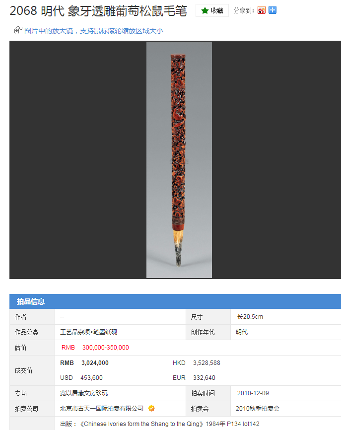 而在拍卖网上,却看到了些许毛笔的身影,但年代也只有到明、清。一只明代毛笔几百万,不免好奇,究竟是笔、还是笔身的价值了~