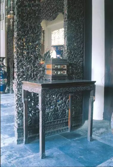 储秀宫改造后的四进庭院宽敞幽静,两棵苍劲的古柏耸立其中,殿台基下东西两侧安置一对戏珠铜龙和一对铜梅花鹿。回廊壁上刻满了大臣们恭写的《万寿无疆赋》。正殿装修精巧华丽,正中设地屏宝座,后置五扇紫檀木嵌寿字镜心屏风,上悬“大圆宝镜”匾。