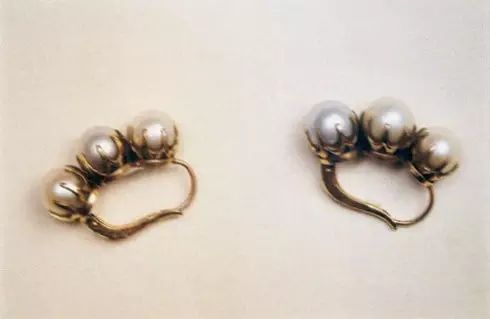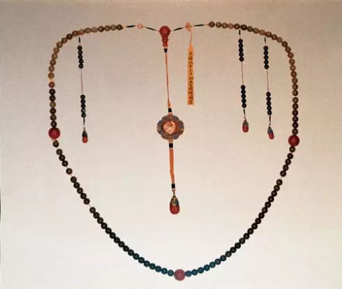 脖颈上有朝珠三挂,两挂是珍珠的,一挂是红宝石的。