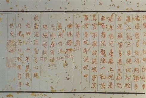 图为由捻金线织成的陀罗尼经被,经被约三米见方,明黄缎底,被面上织有众多佛经、佛像、佛塔、花纹等装饰,既有佛教的神圣,又不失皇室的威严。
