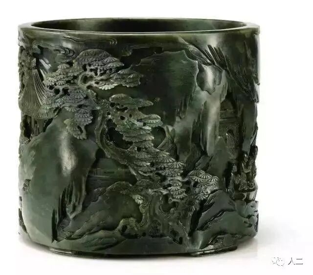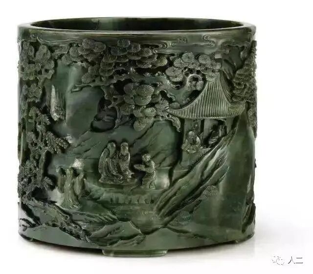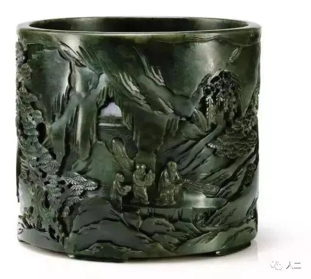 清康熙至乾隆 碧玉雕五老图笔筒