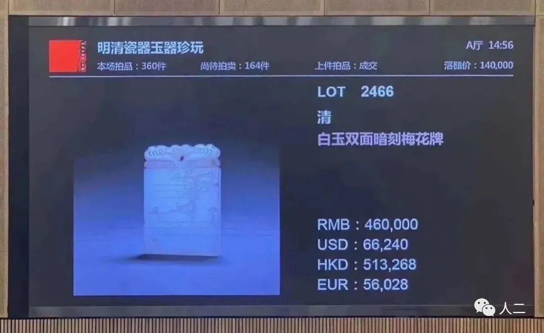 清 白玉双面暗刻梅花牌 尺寸:长6.6cm 起拍价:RMB 50,000