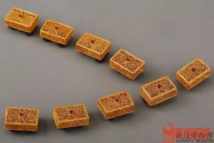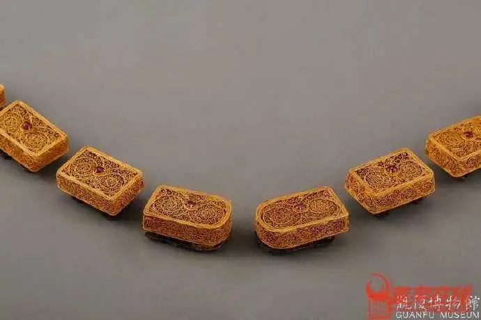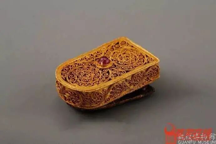 到了明代,带銙更见宽大,原本用作束腰的实用配件成了累赘的装饰品。用作括结的带扣被更为方便卡扣的「三台」取代,带銙数量显著增加,尾分别位于革带两侧,用于调节腰带长度。此组蹀躞带共37块,每块用金丝包裹白玉,工艺精湛,缠绕朦胧,并在外面镶嵌红宝,精美繁复,为明代宫廷制品。至清代,松垮的带銙已不见踪迹,革带改系在补褂之内,不再外露。其上虽保留了方圆四枚带板,但已失去了彰显主人身份地位的用途与舞台,渐渐式微也自然是情理之中的了。注:本文转自网络,不代表本平台立场,仅供读者参考,著作权属归原创者所有,如涉及版权等问题,请作者添加小编微信(guwannadianshi-6)与我们联系,我们将在第一时间处理,感谢!