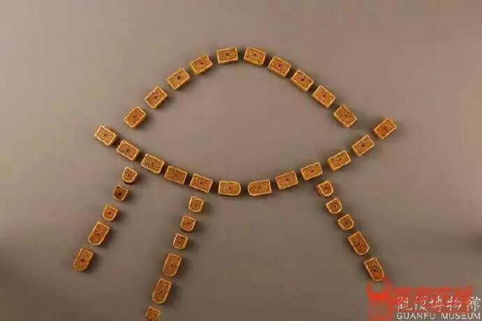 这条金銙银蹀躞带是大辽陈国公主与驸马合葬墓中驸马腰部的原物,带鞓和系垂的小带用薄银片建造,银带鞓的前端铆有1件金带扣,套金带箍1件,中部钉11件方形兽面纹金带銙,后部钉5件桃形有孔金带銙,带末尾钉1件圭形金铊尾。